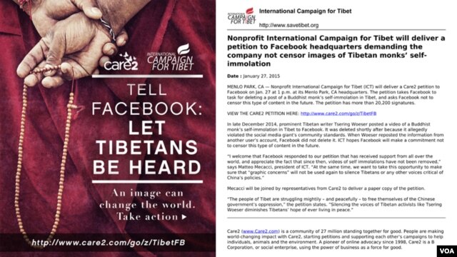 དེབ་ལས་ཁུངས་ལ་བོད་ནང་གི་གནད་དོན་མཚོན་བྱེད་ཀྱི་བརྙན་རིས་སོགས་བཀག་འགོག་བྱས་མི་ཆོག་པའི་ཞུ་གཏུག་བྱས་པའི་ཐད་རྒྱལ་སྤྱིའི་བོད་དོན་ལས་འགུལ་ཁང་གི་འགན་འཛིན་གཞོན་པ་བུ་ཆུང་ཚེ་རིང་ལགས་དང་བགྲོ་གླེང་ཞུས་པ་ཡིན།། དེ་ཡང་རྒྱལ་སྤྱིའི་བོད་དོན་ལས་འགུལ་ཁང་གི་འགན་འཛིན་མཱ་ཐེའོ་མེ་ཁ་ཆི་ལགས་དང་། དྲ་ལམ་གྱི་ཐོབ་ཐང་དོན་གཉེར་ལས་ཁུངས་Care2 ཞུ་བའི་འགན་འཛིན་གཞོན་པ་ཇའོ་བྷེ་ཁེར་གཉིས་ཕྱི་ཟླ་དང་པོའི་ཚེས་༢༧་ཉིན་ཨ་རིའི་མངའ་སྡེ་ཁ་ལི་ཧྥོར་ནི་ཡའི་ནང་ཡོད་པའི་ངོ་དེབ་ལས་ཁུངས་སུ་བཅར་ཏེ་ངོ་དེབ་ཀྱི་འགན་འཛིན་མར་ཁེ་ཟོ་ཁེར་བྷིར་ཁི་ལགས་ཀྱི་མཚན་ཐོག་ཏུ་འཛམ་གླིང་རྒྱལ་ཁབ་༡༣༠་ལྷག་ནས་མི་ཉིས་ཁྲི་ལྷག་གིས་མཚན་རྟགས་བཀོད་པའི་ཞུ་གཏུག་ཡི་གེ་ཞིག་ཕུལ་ཏེ། བོད་ཀྱི་གནས་སྟངས་བརྗོད་པའི་བོད་མི་རྣམས་ཀྱི་སྐད་ཆ་ནི་བཀག་འགོག་གང་ཡང་མེད་པར་སྤྱི་ཚོགས་དྲ་རྒྱ་དེའི་སྟེང་གོ་ཐུབ་པ་བྱེད་དགོས་ཞེས་འབོད་སྐུལ་བརྒྱབ་ཡོད།། དེ་ཡང་ཕྱི་ཟླ་བཅུ་གཉིས་པའི་ནང་དགེ་འདུན་པ་སྐལ་བཟང་ཡེ་ཤེས་ལགས་ཀྱིས་རང་ལུས་མེར་སྲེག་སྒོས་རྒྱ་ནག་གཞུང་ལ་ངོ་རྒོལ་གནང་བའི་བརྙན་པར་ཞིག་བོད་ཀྱི་རྩོམ་པ་པོ་འོད་ཟེར་ལགས་ཀྱིས་ངོ་དེབ་སྟེང་དུ་བཀོད་པ་དེ། ངོ་དེབ་ལས་ཁུངས་ཀྱིས་ནག་བསུབ་བྱས་པར་བརྟེན། འོད་ཟེར་ལགས་ཀྱིས་ངོ་རྒོལ་གནང་བ་དང་། ངོ་དེབ་ལས་ཁུངས་ཀྱིས་ནང་དོན་འཇིགས་སུ་རུང་བ་ཡིན་པས་བཀག་པ་ཡིན་ཞེས་འགྲེལ་བཤད་བྱས་པ་རེད།། ཨ་རིའི་རླུང་འཕྲིན་ཁང་ནས།།